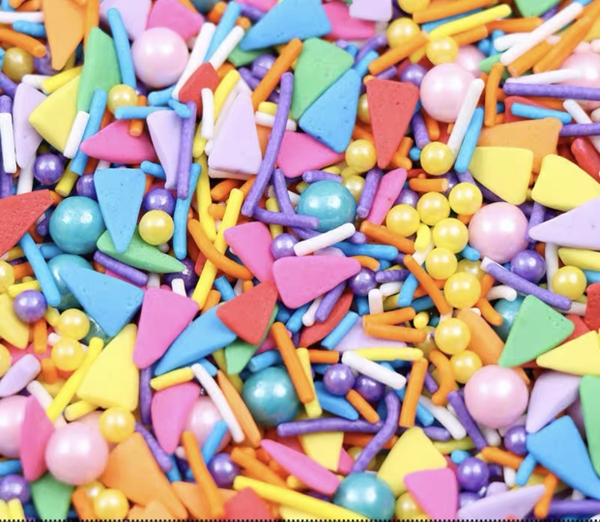 Cốm đường mix bi tròn hồng và hình tam giác sắc màu (túi 100gam).