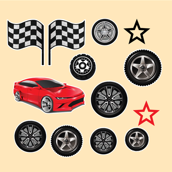 Combo 2 set giấy - ô tô đỏ, bánh xe và lá cờ.