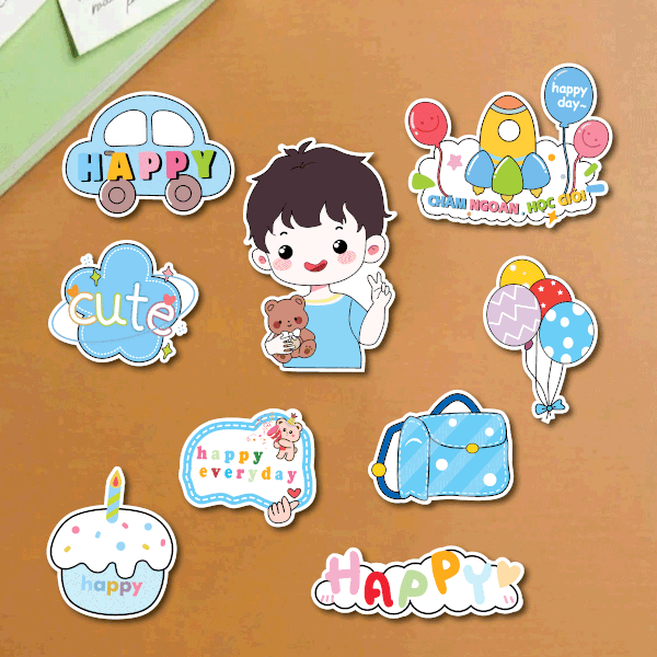 Combo 5 set giấy SX- bé trai áo xanh dương ôm gấu giơ tay chữ V xì tin.