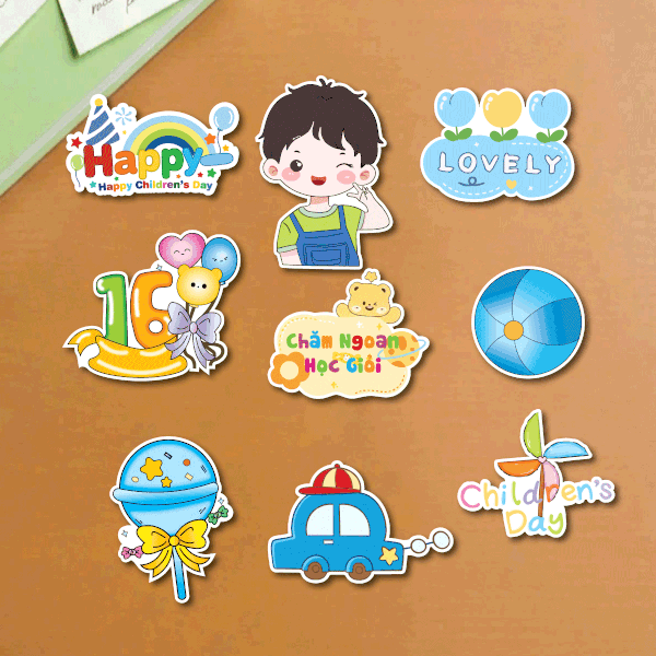 Combo 5 set giấy SX- bé trai áo yếm xanh giơ tay chữ V xì tin.